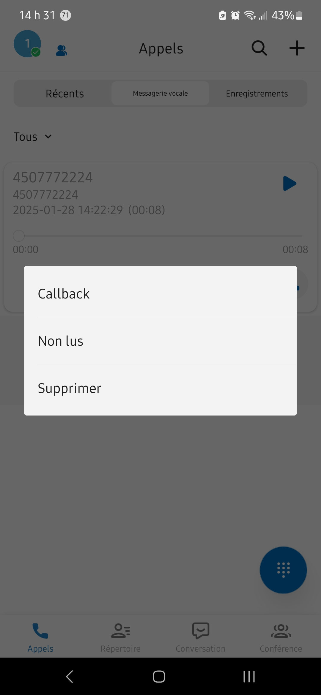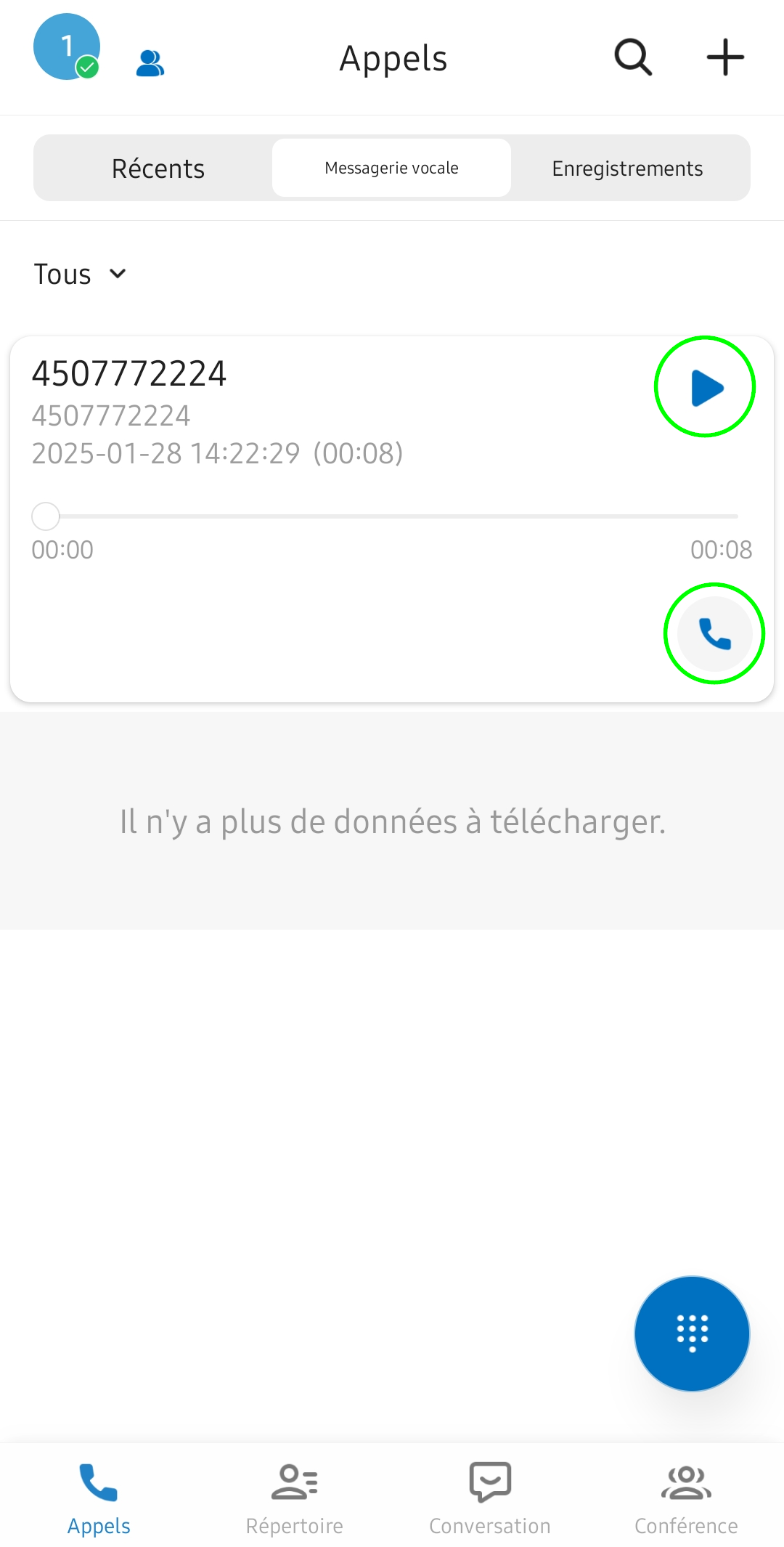 Select Voicemail Tap a message to listen or call the person back. Press and hold a message to display more options.